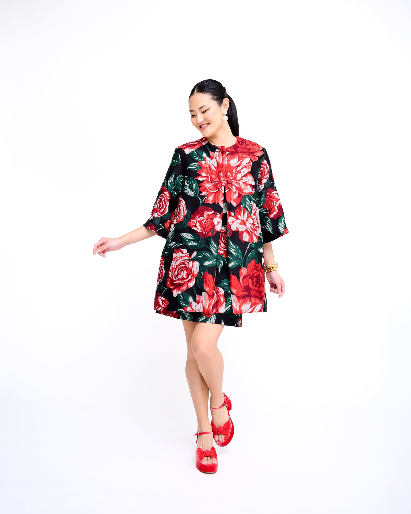 this season's classic audrey coat is crafted for timeless sophistication from a textured rose jacquard.  pair her back to solids for a statement or mix her with leopard print for a Valerie Dittner approved print on print moment.
