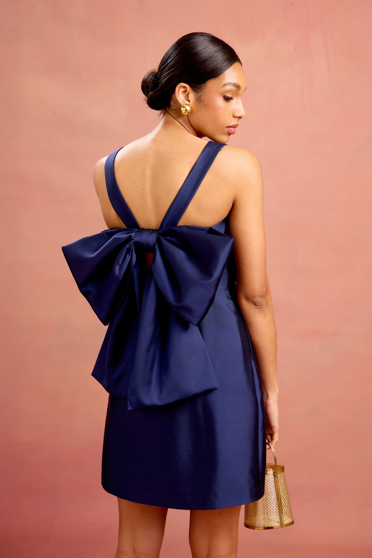 Soft inverted pleats at the waist create a flattering silhouette, while the deep navy hue makes Eliza the ultimate statement for a summer cocktail occasion. Additional colors and added length can be made available upon request.