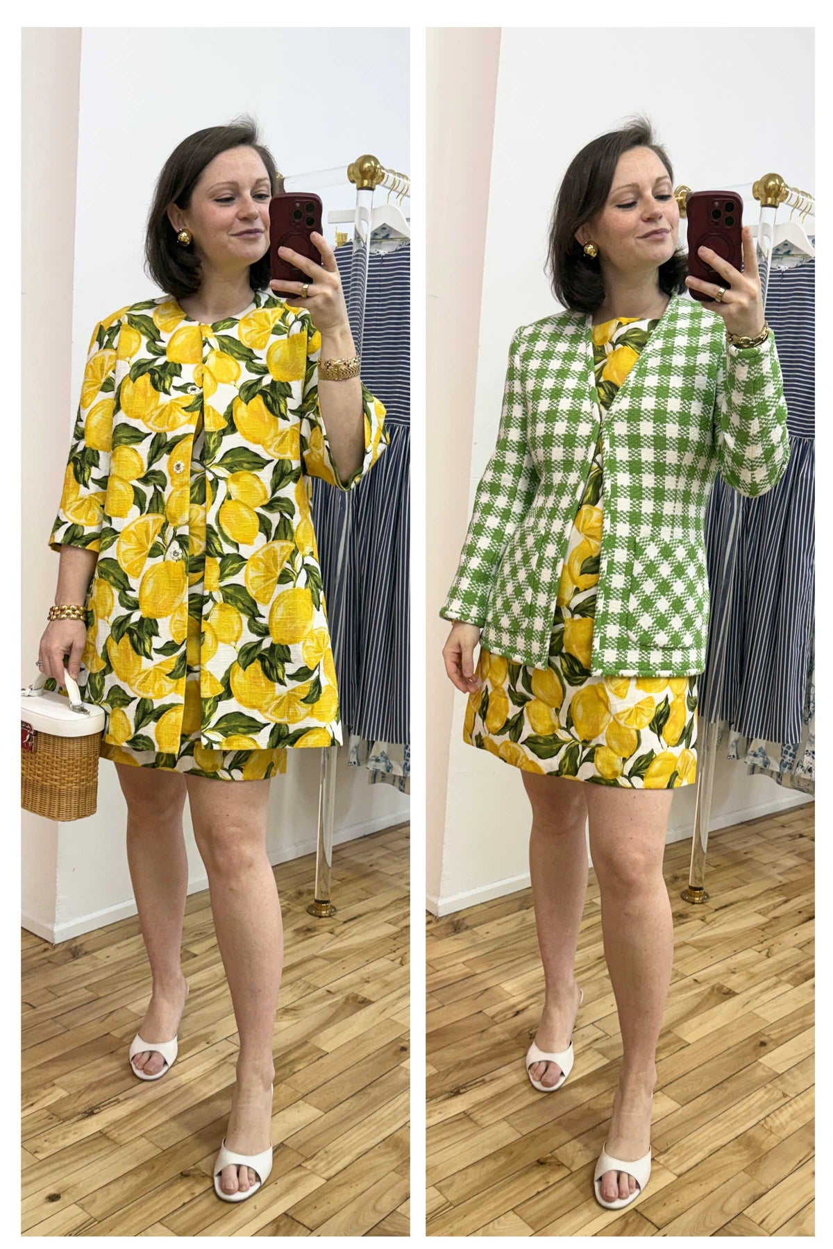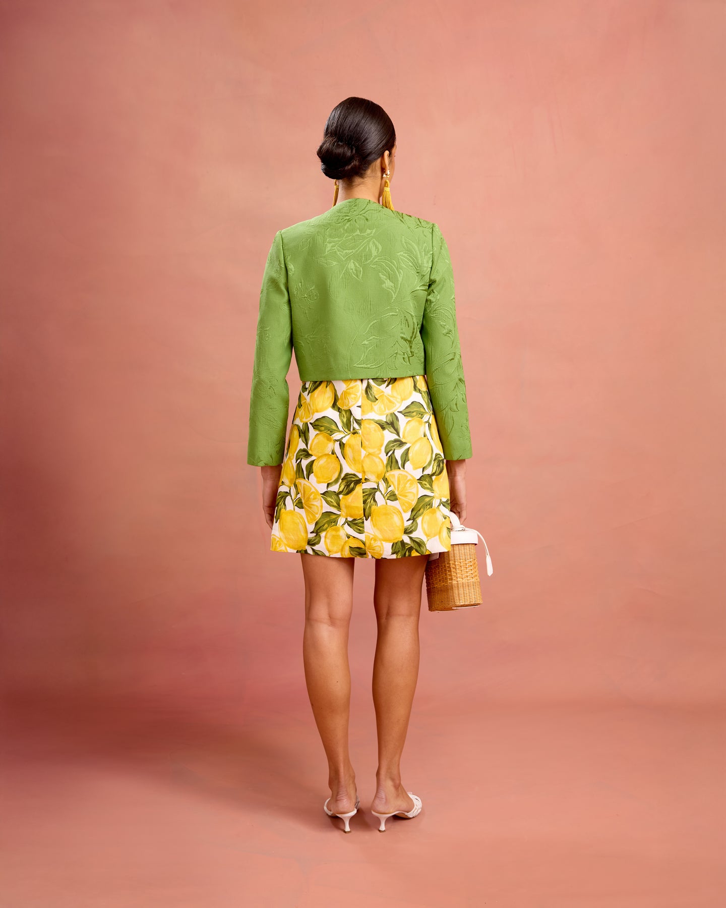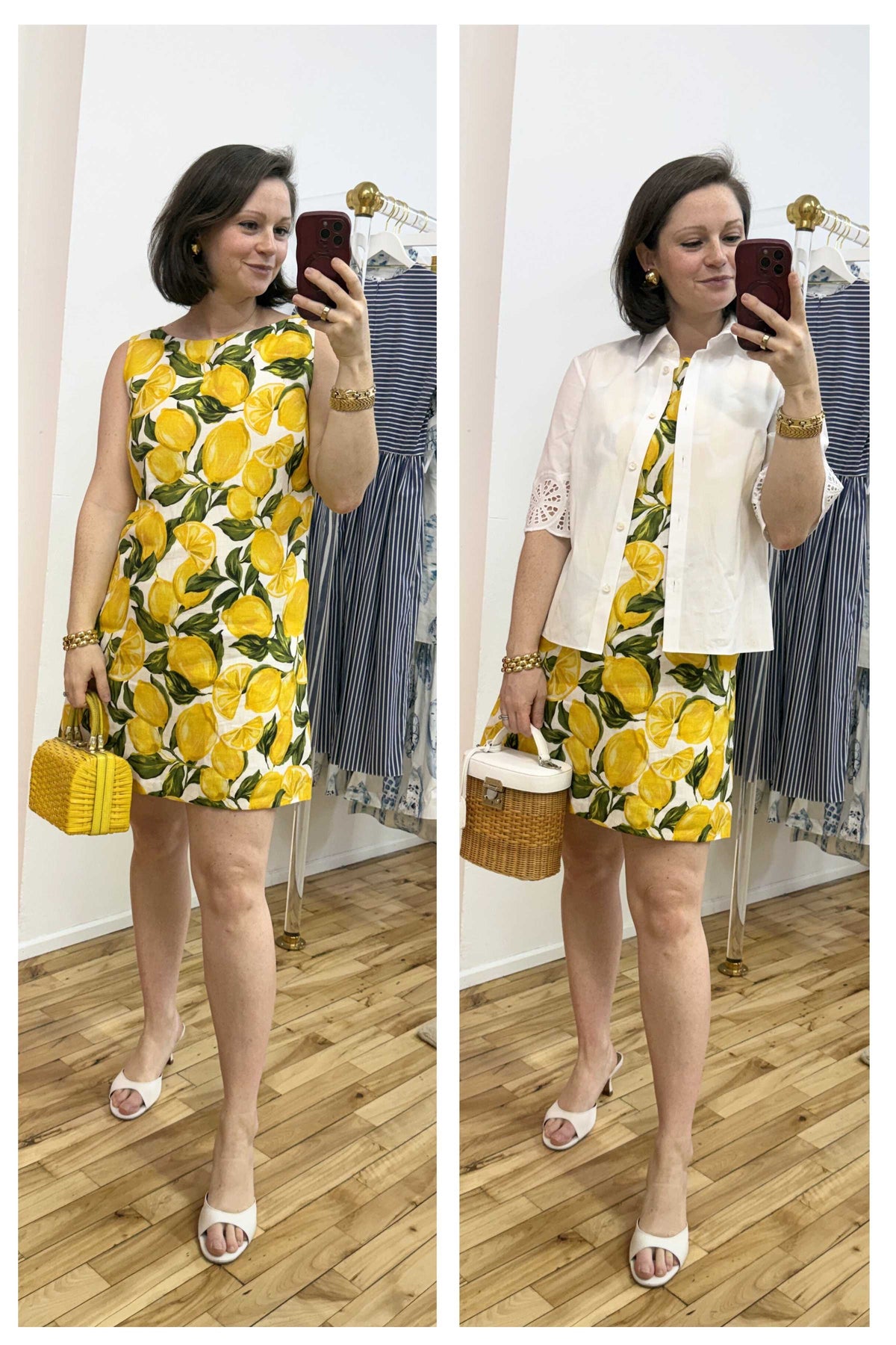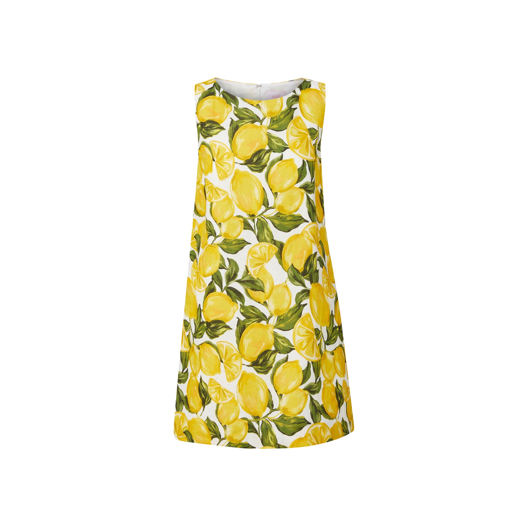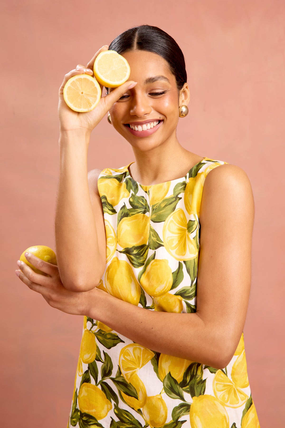 The Katy Dress reimagines our signature Laurel with a clean, open boat neckline for summer. Cut from lightweight linen and lined in cotton voile, she’s designed to stay cool while holding her shape. Fresh-picked and sunlit—our signature lemon grove print brings a crisp, joyful energy to the silhouette. Pair her with the Audrey Coat for a perfectly matched moment or dress her up with the embellished Blaire Jacket.
