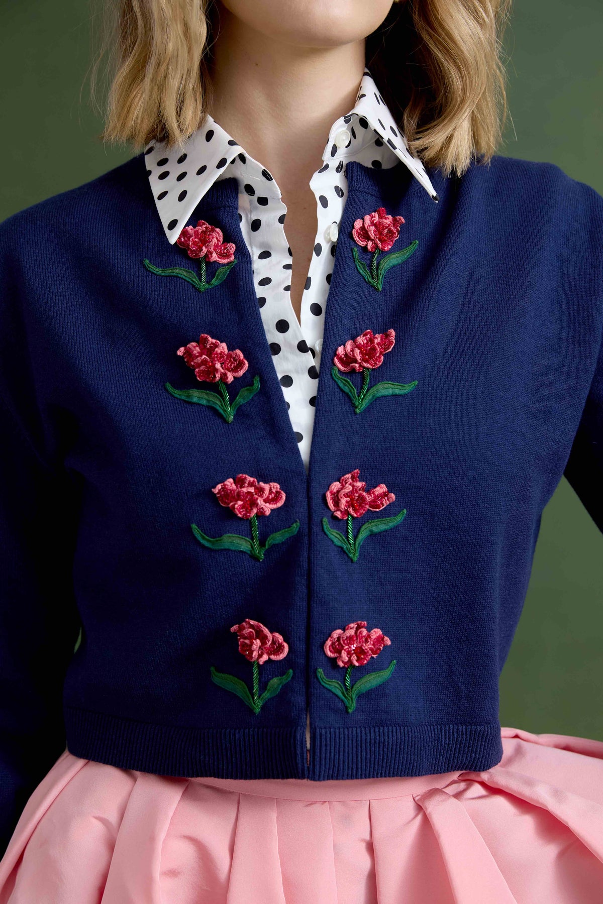 The Bailey Knit Jacket returns in Cadet Navy, drawing inspiration from iconic 1950s knit jackets. Crafted from a cotton-wool blend with a satisfyingly substantial hand feel, she’s both refined and enduring. Finished with hand-placed Chelsea Rose embellishments, delicate interior closures, and grosgrain ribbon—every detail considered.