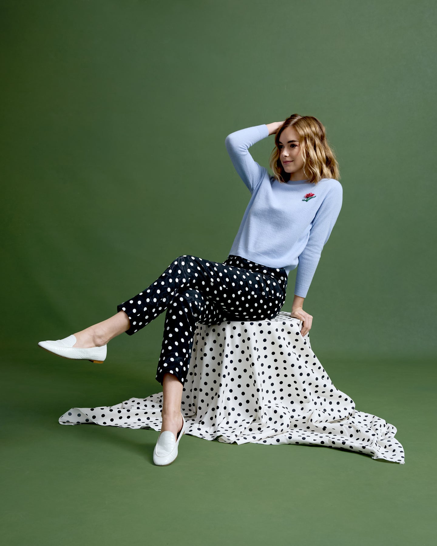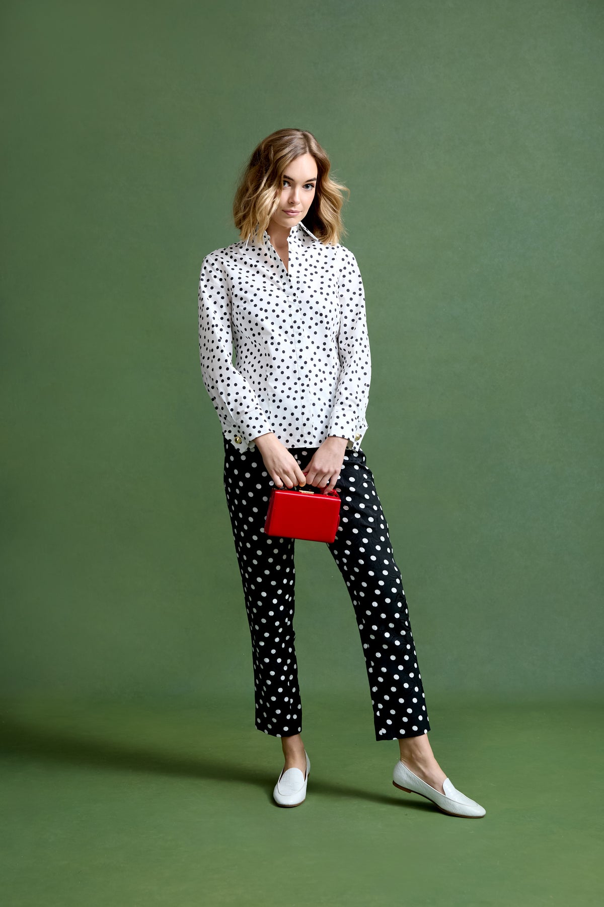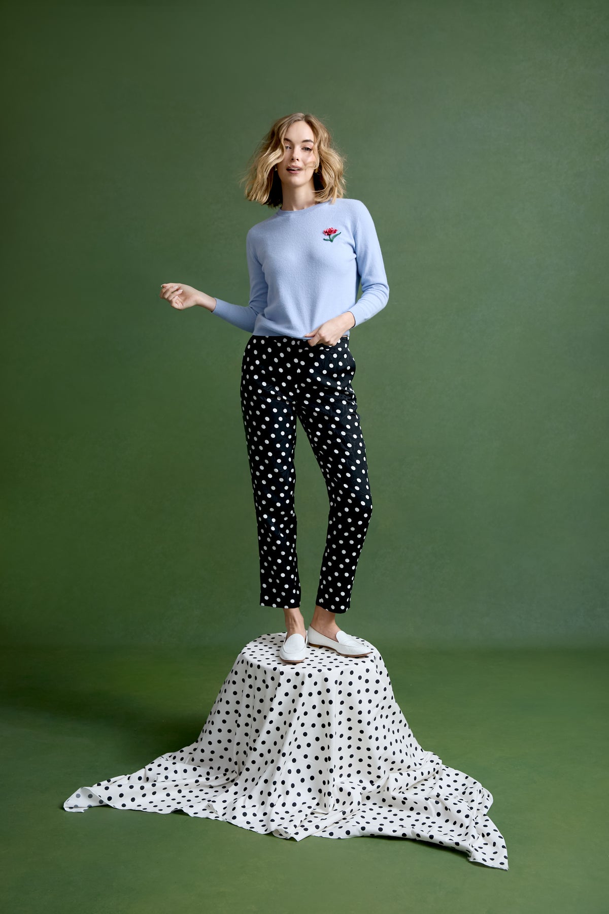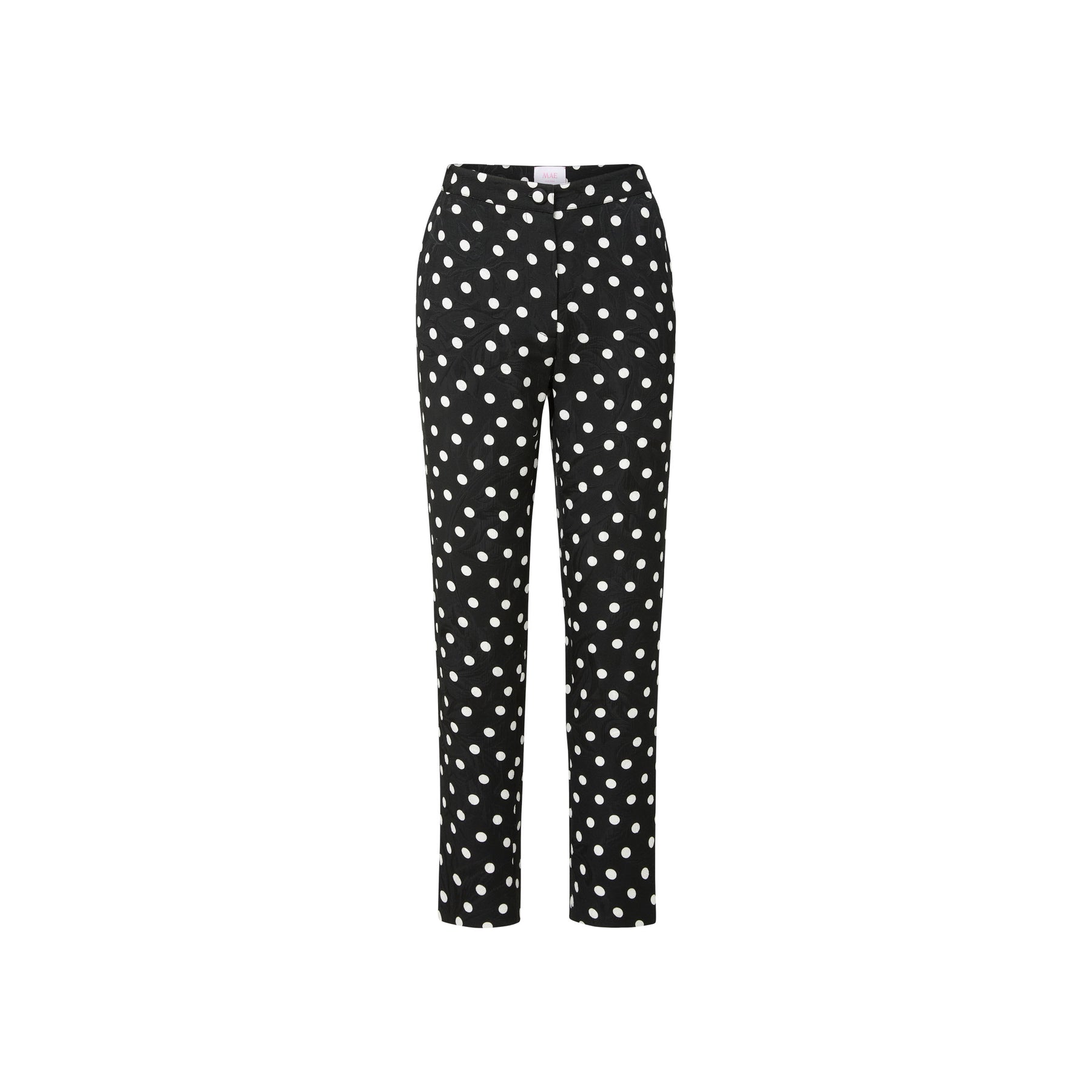 The Brooke Pant is a high-waisted, slim trouser reimagined in playful polka dots layered over a subtle floral brocade, crafted in Italy. Sleek and versatile, she elevates everything from meetings to evenings out. Pair back to coordinating polka dots, bright florals, or bold colors for an unexpected closet hero piece.
