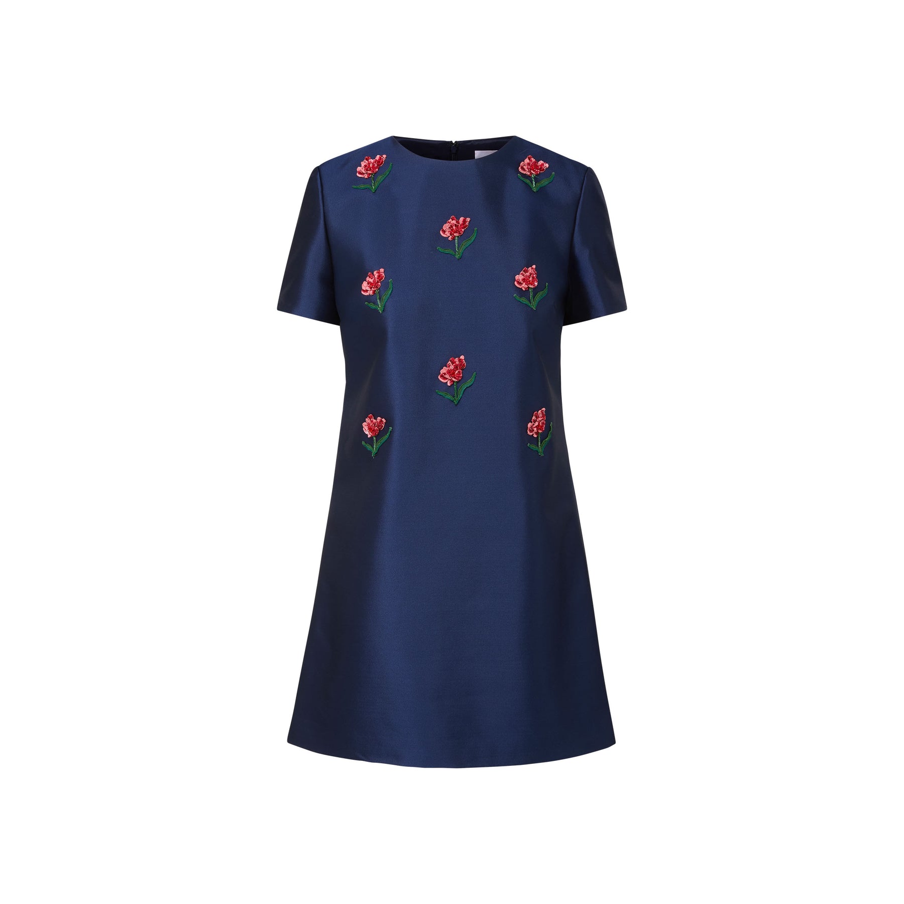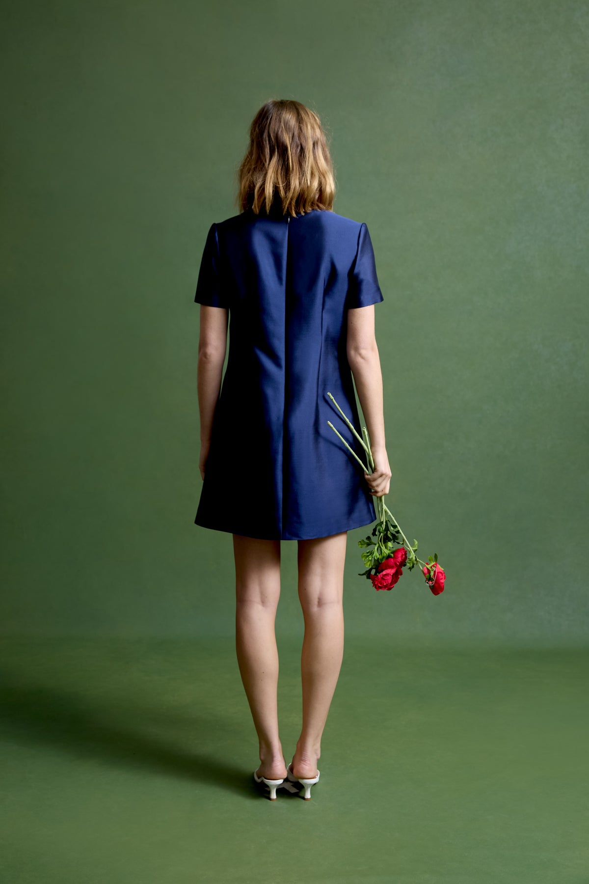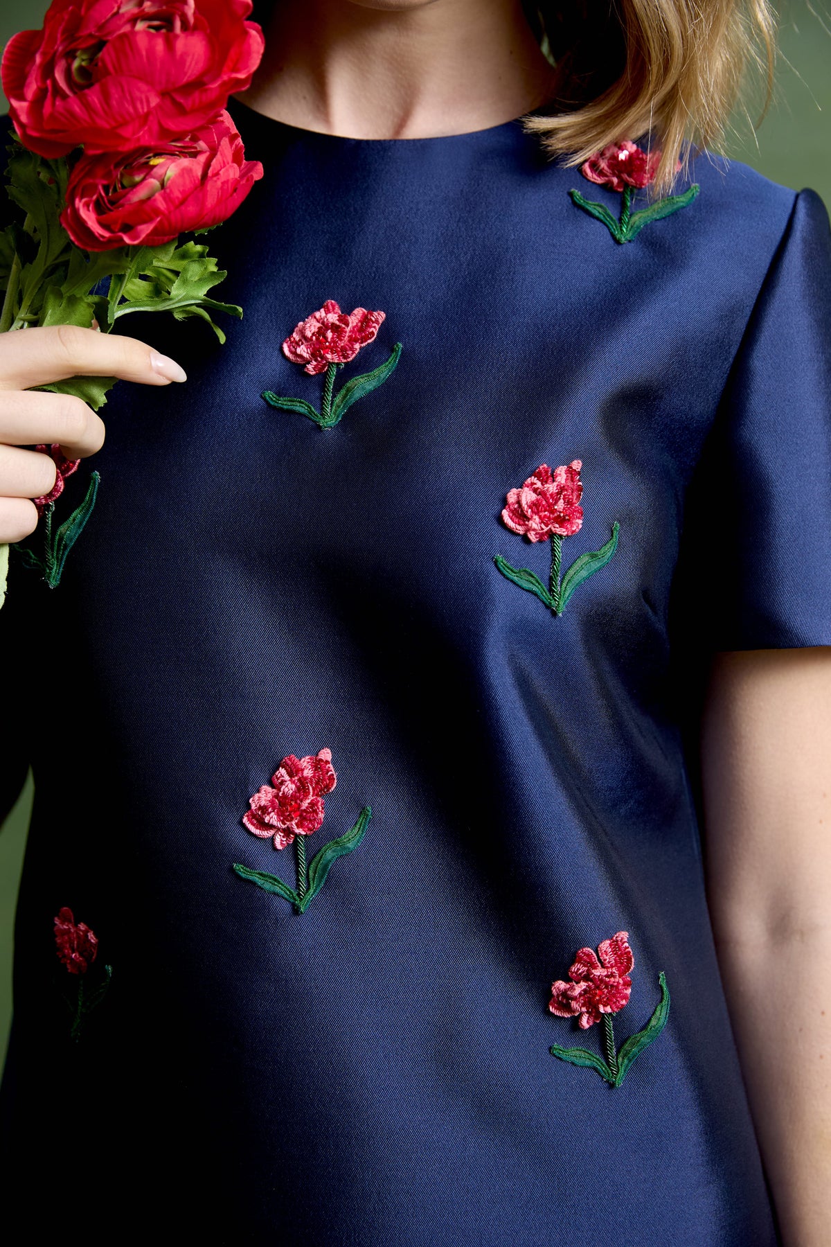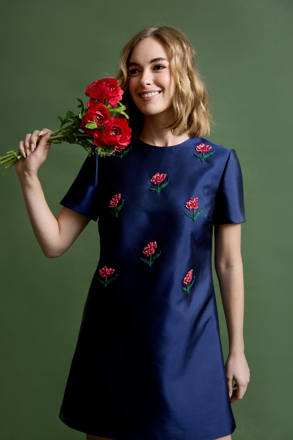 The Madison Dress returns for spring in Metropolitan Navy, a rich navy silk wool with timeless allure. Hand-placed Chelsea Rose embellishments—complete with sequins, silk organza, and sculptural petals—add romance without excess. A natural choice for cocktail hours, wedding guests, and elegant luncheons alike.