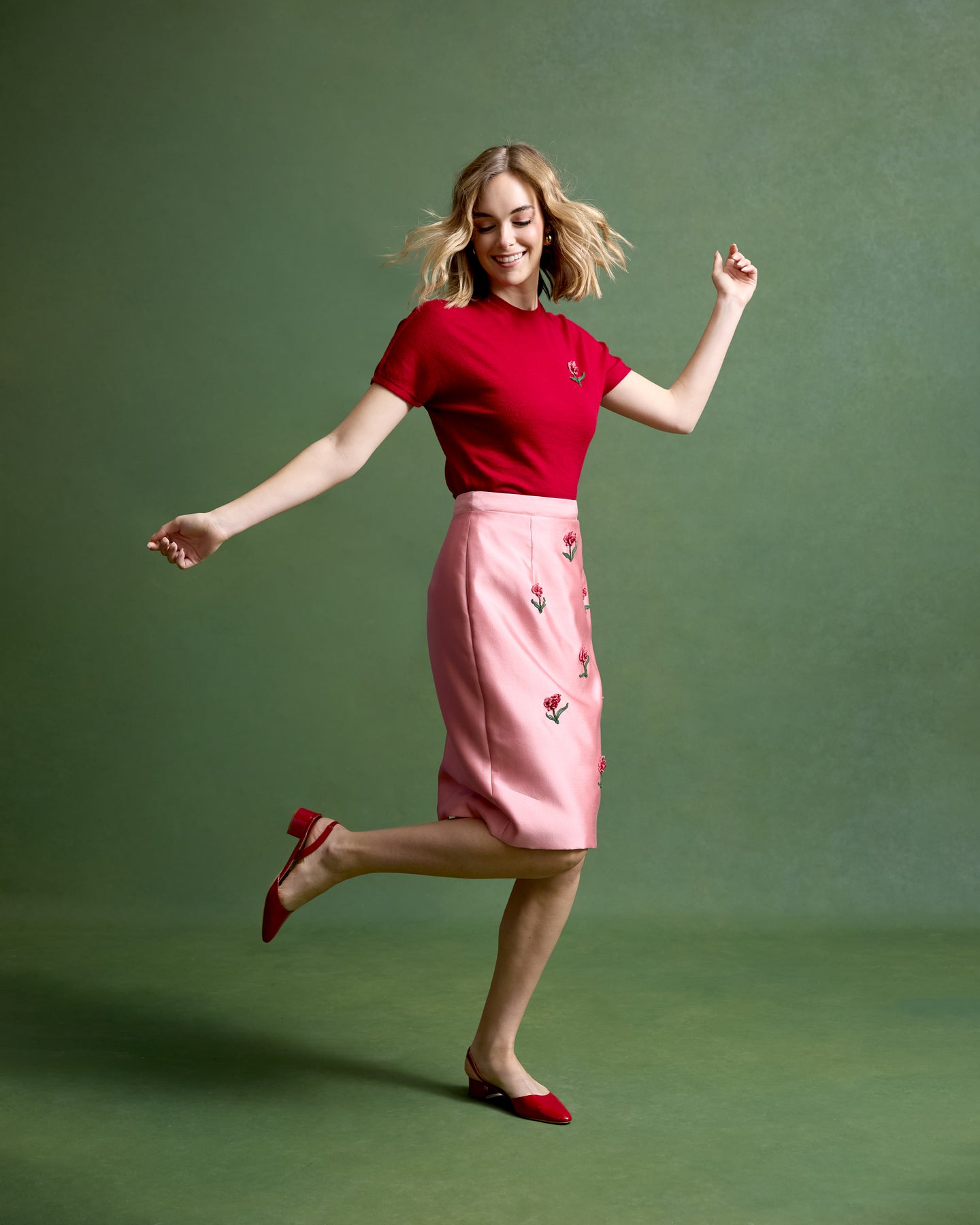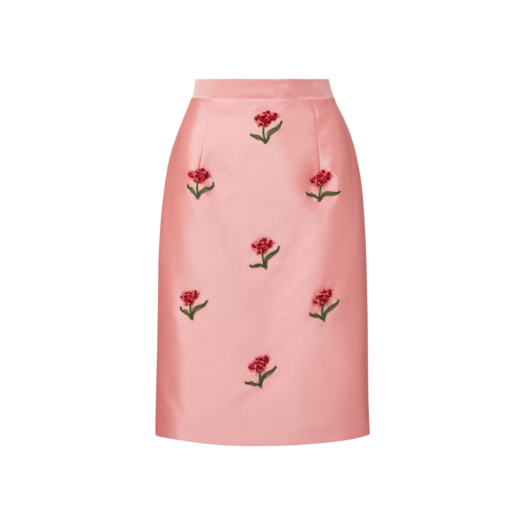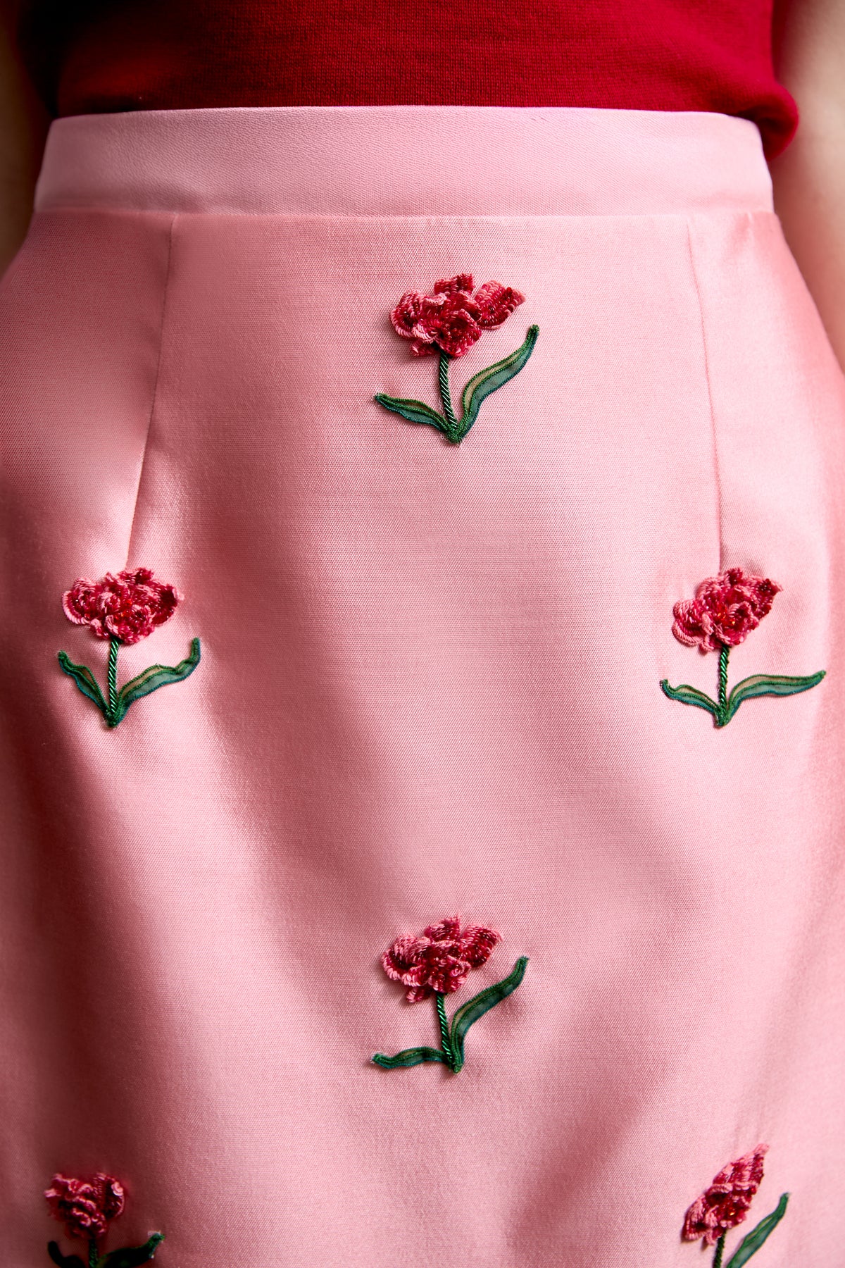 Meet Margaret, the knee-length sister to our beloved Sienna Skirt, reimagined in petal pink silk wool. Impeccably tailored and delicately embellished, each chelsea rose embellishment is placed and stitched by hand for dimensional beauty. Pair her with the Carmen Sweater for a chic color-block moment, or the Ginger Top for effortless refinement.
