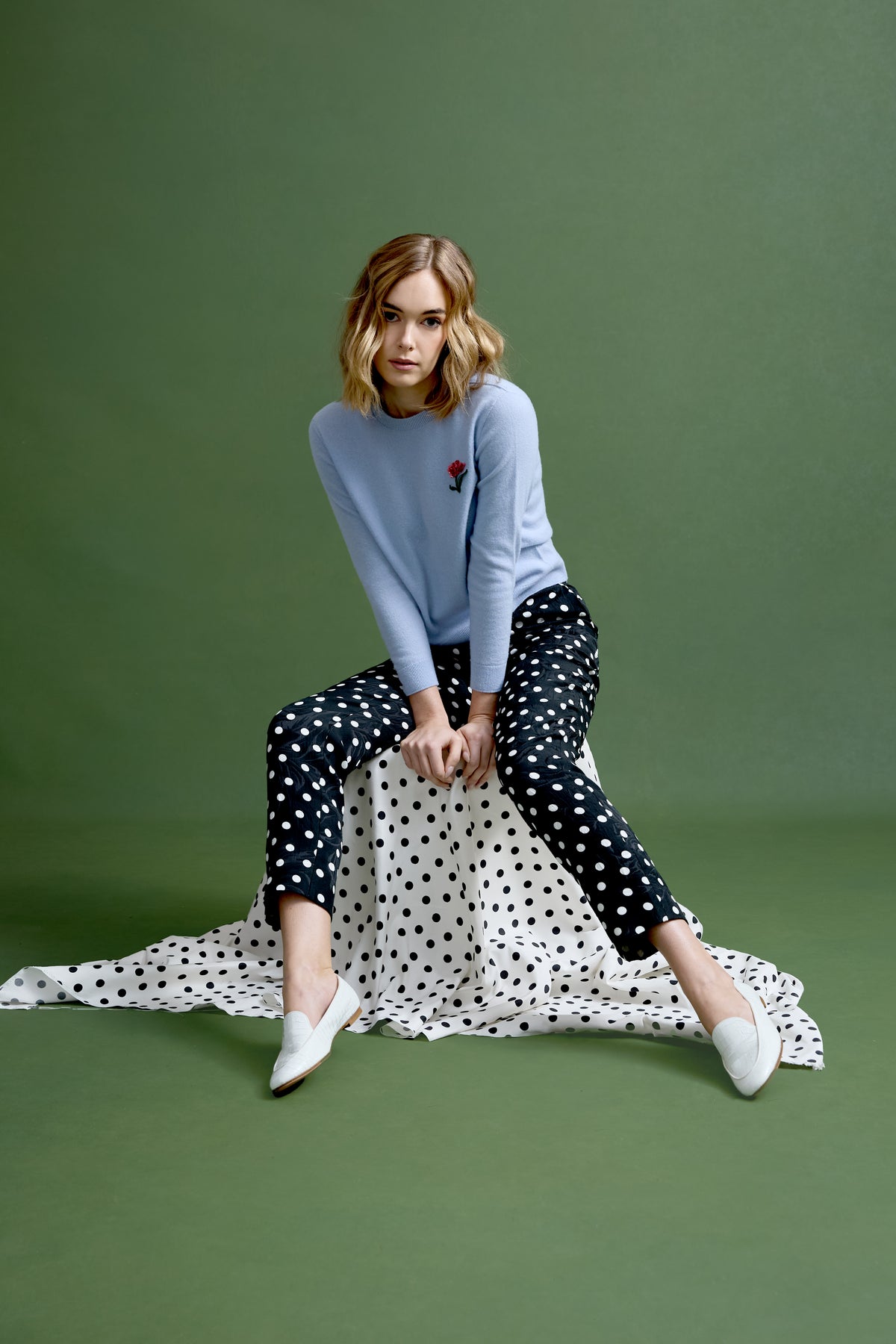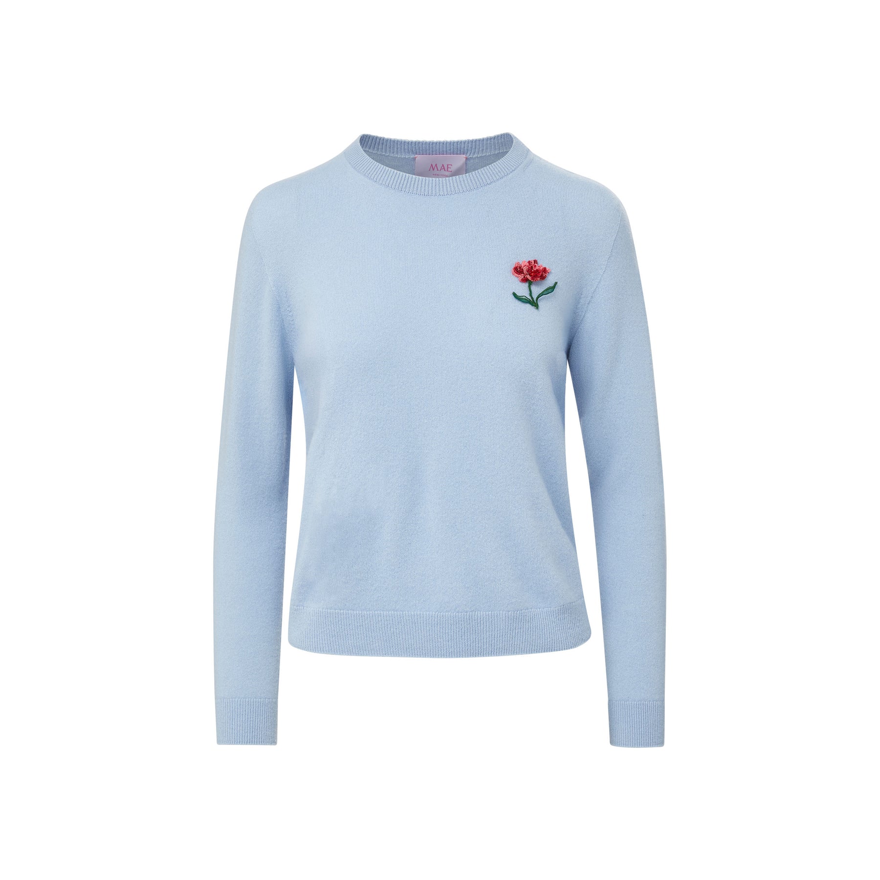 The Paige Sweater is pure MAE charm in Carnegie Blue, spun from 100% Scottish cashmere. A timeless crewneck with bracelet-length sleeves, elevated by our delicate Chelsea Rose embellishment. Each rose is hand-sewn with sequins, silk organza, and dimensional petals—proof that classics can still surprise.