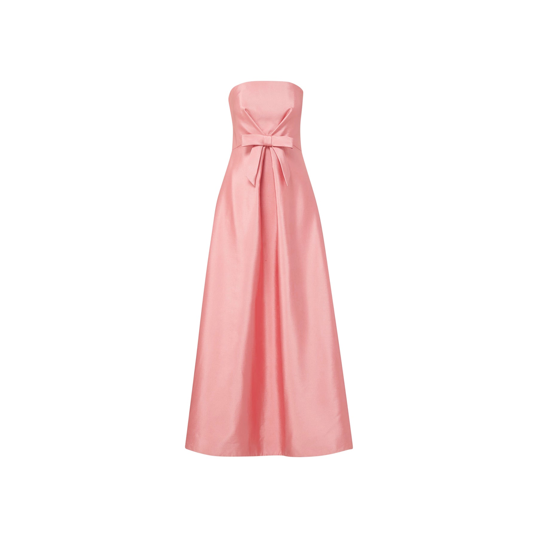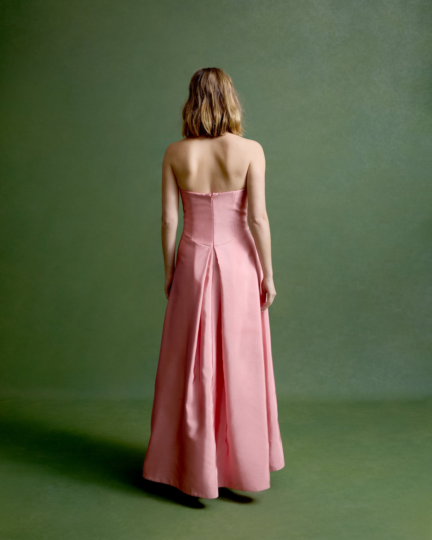 The Sabrina Gown takes inspiration from iconic 1950s and 1960s ballgowns, refined through the MAE New York lens. A softly dipped waistline, sculptural pleating, and subtle train create elegant volume, while a fully boned interior corset offers built-in support. Finished with a signature MAE bow—and yes, side seam pockets—she proves that evening wear can be both dramatic and practical.